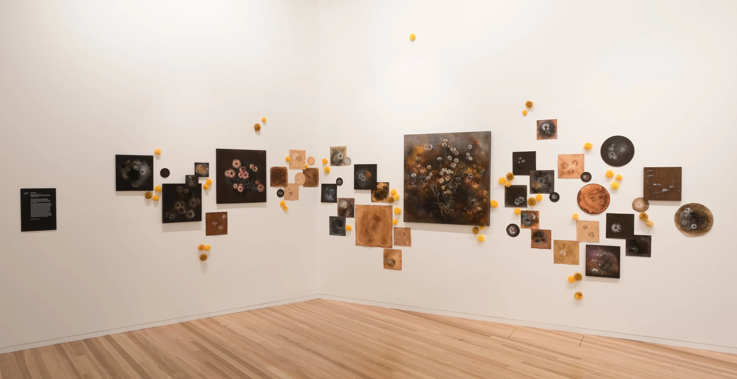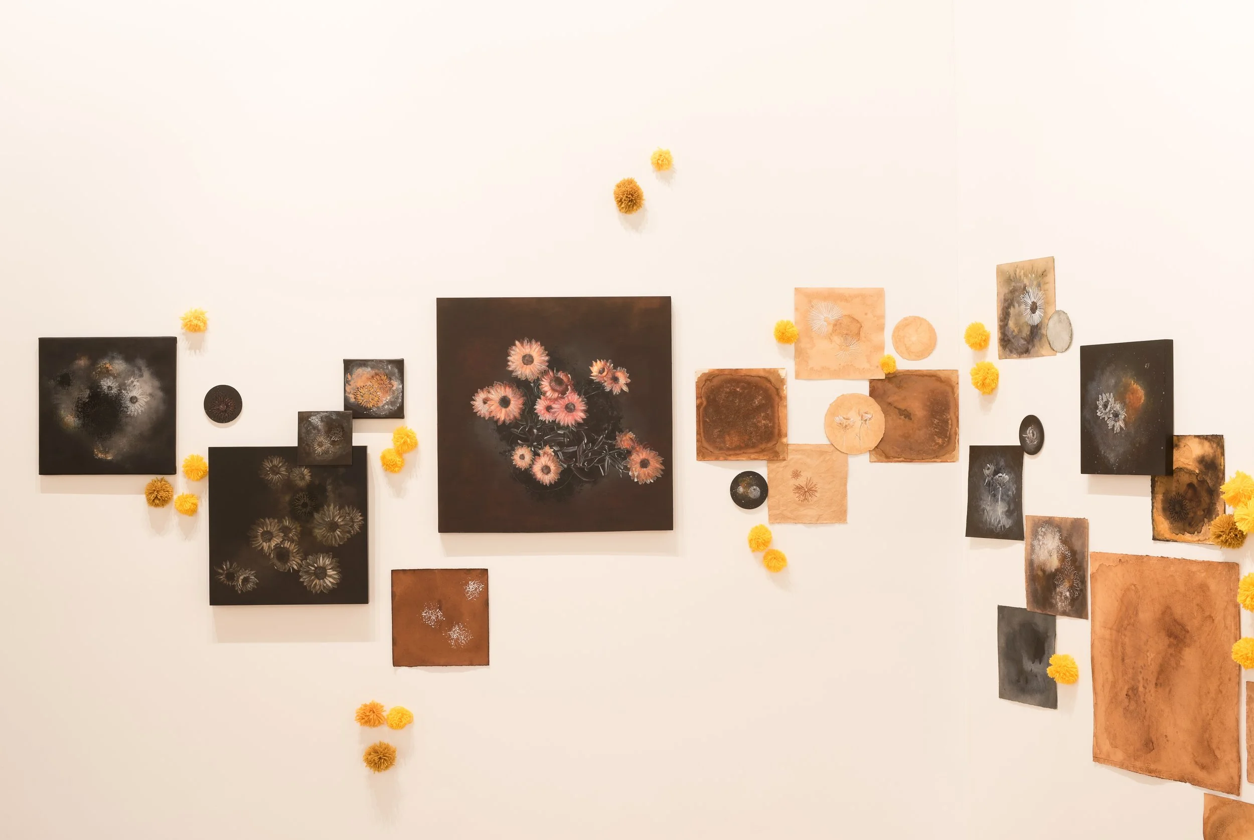 3. Penelope Aitken, Ephemeral Everlasting, 2015, installation, oil paint, plant ink and cotton thread on wood and paper, wool pom poms, approx. 600 x 150 cm